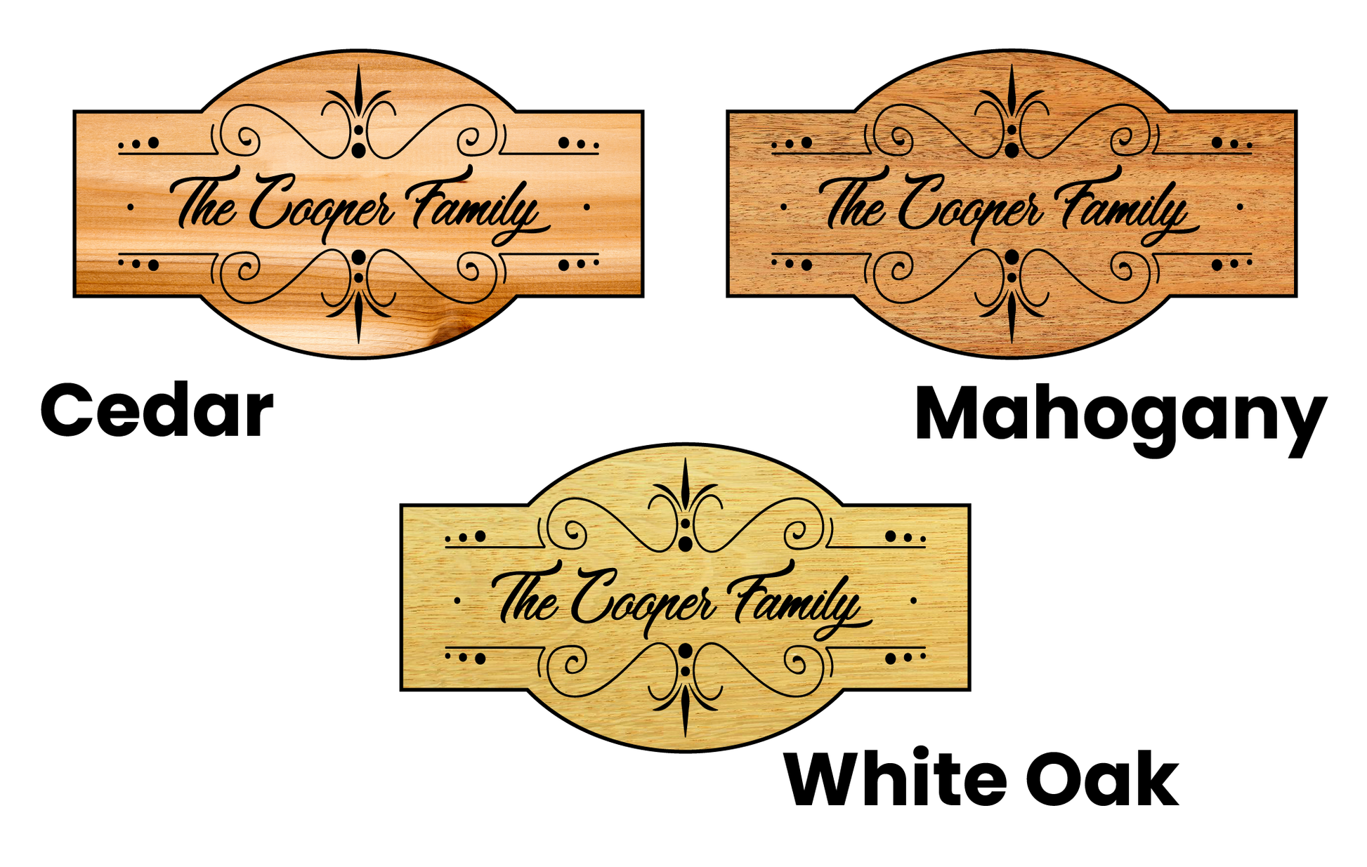 Cedar, Mahogany or Quarter-Sawn White Oak wood. You'll have the choice when designing your sign.